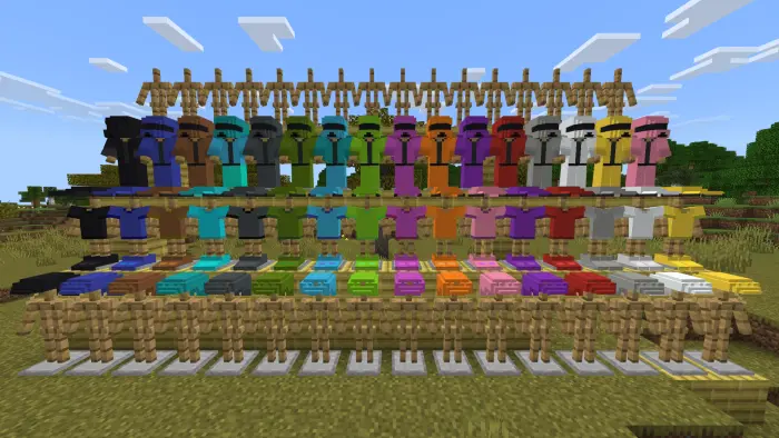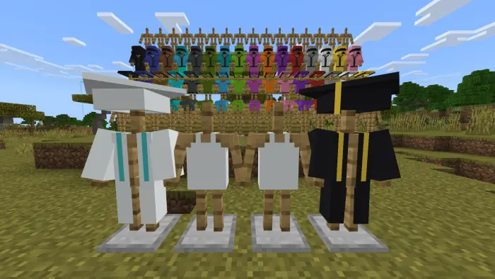 How it works: suits equip like normal gear (hat, chest, legs, boots) but read as clothing—blazers with ties/bowties, dress pants, polished shoes, plus a couple extras like vests, coats, and turtlenecks depending on the set. Most packs keep stats neutral (cosmetic only), so you’re not cheesing PvP; you can always carry real armor and swap when a fight pops off. Colors are easy: grab the shade you want from the creative tab or pick dyeable variants if the pack supports them.