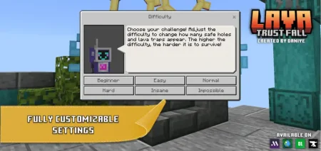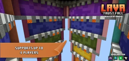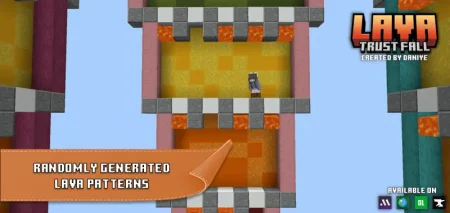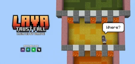 Pick a hole, say a prayer, and drop. The Lava Trust Fall mod brings the classic Java party game to Minecraft Bedrock: stacked floors with cut-outs, some safe water, some straight lava. You and up to 4 players start on the top platform, pick a hole, and dive. Survive the layer, sprint to the next, repeat until someone hits the finish—or flames out on the way.