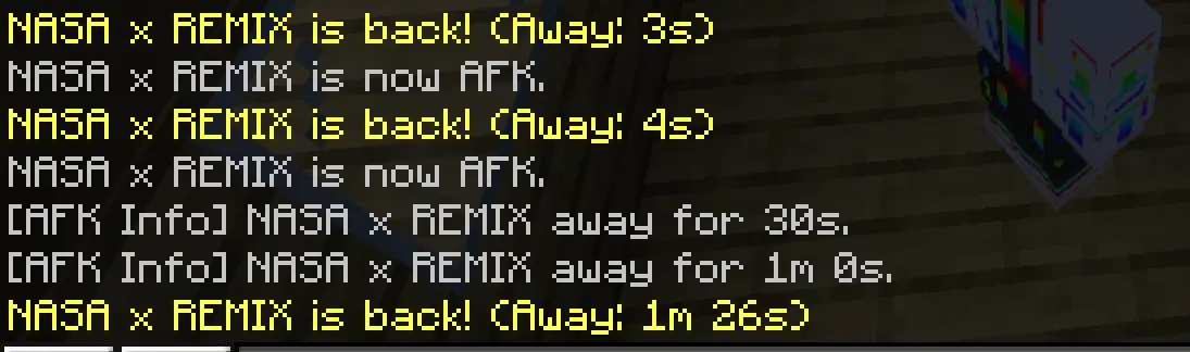 Once the AFK state kicks in, the mod does a few things to make it crystal clear to everyone else. Angry villager particles pop over the player every couple of seconds like a little storm cloud, and their nametag updates to include a clean [AFK] tag. You can scan a lobby, trading hall, or base and instantly tell who is around to talk or trade and who is just parked.