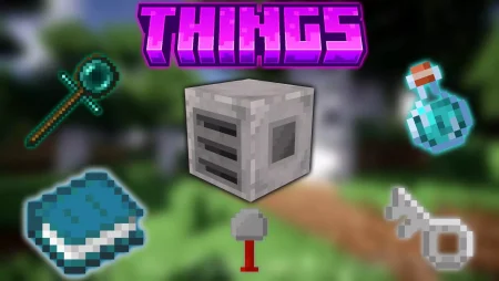 Things mod hands you practical utilities for Survival—swap blocks with a Brick Towel, lock chests with a Container Key, recall to spawn, save waypoints with a Teleport Book, blink 100 blocks with a Teleport Wand, and auto-farm logs with a Sapling Mill.
