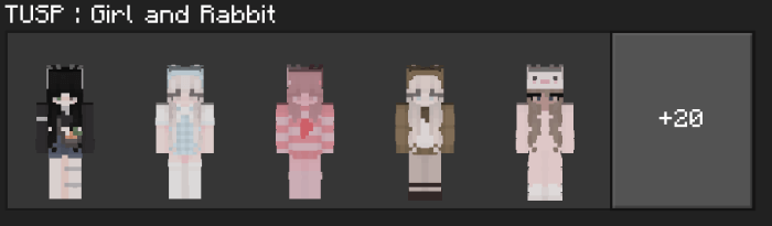 TUSP : Girl and Rabbit Skin Pack mine 12-12-2024, 14:36 520 Skins TUSP : Girl and Rabbit - download a skin pack that contains beautiful and funny skins of rabbits for girls.girl-and-rabbit.mcpack [34.16 Kb] (downloads: 76)